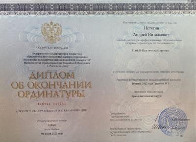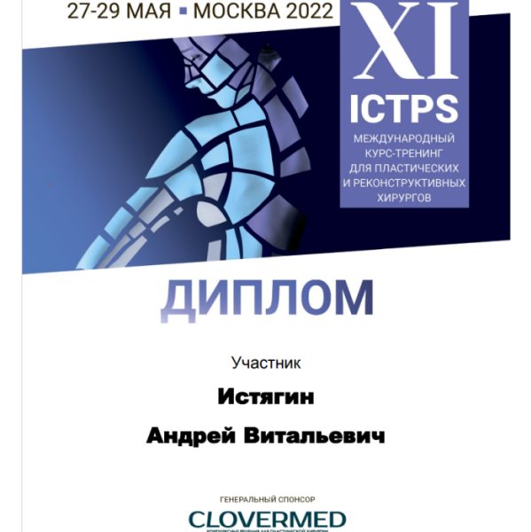 - 2022 - Диплом участника "Международного курс-тренинга для пластических и реконструктивных хирургов" - ICTPS - г. Москва