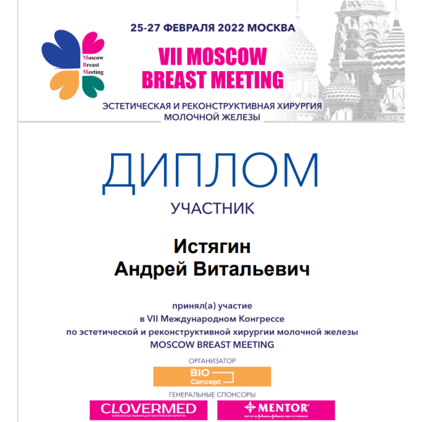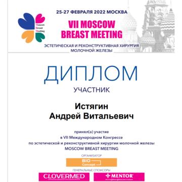 - 2022 - Диплом участника "VII Международного Конгресса по эстетической и реконструктивной хирургии молочной железы" - МВМ - г. Москва