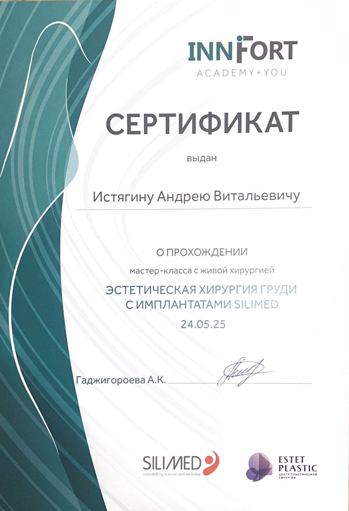 - 2025 - Участник мастер-класса с живой хирургией "ЭСТЕТИЧЕСКАЯ ХИРУРГИЯ ГРУДИ С ИМПЛАНТАТАМИ SILIMED" с экспертом Гаджигороевой А.К. - ESTET PLASTIC - г. Махачкала