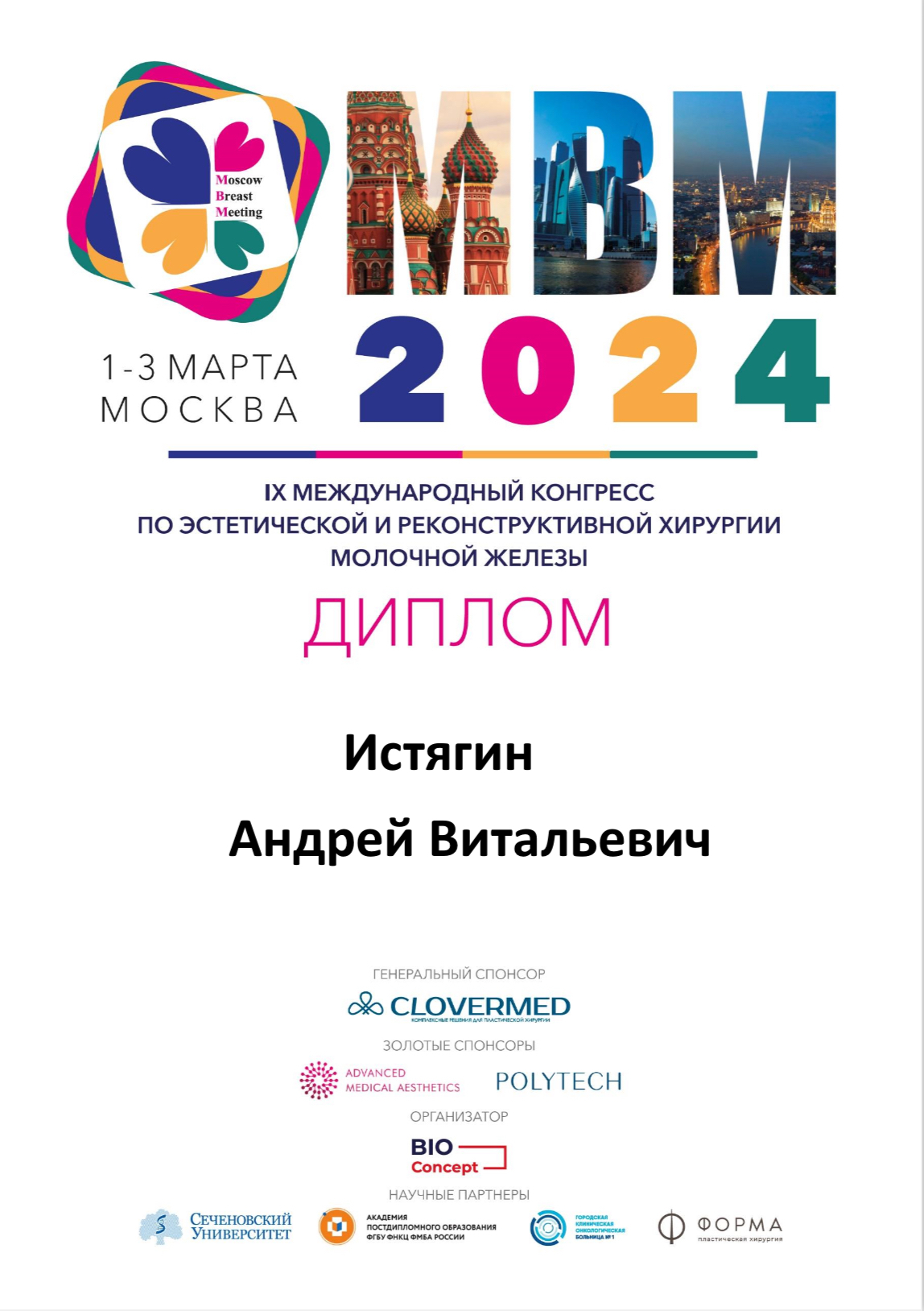 - 2024 - Участник "Международного конгресса по эстетической и реконструктивной хирургии молочной железы Moscow Breast Meeting 2024" - MBM - г. Москва